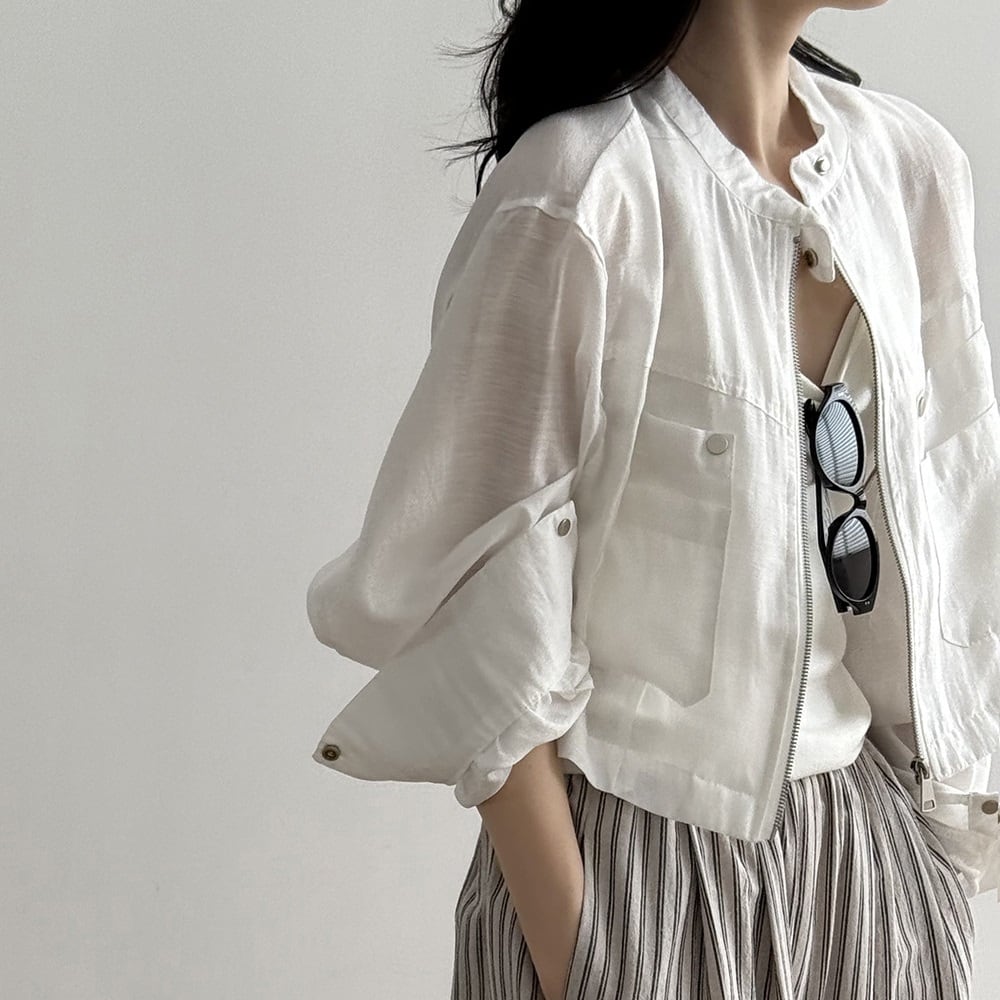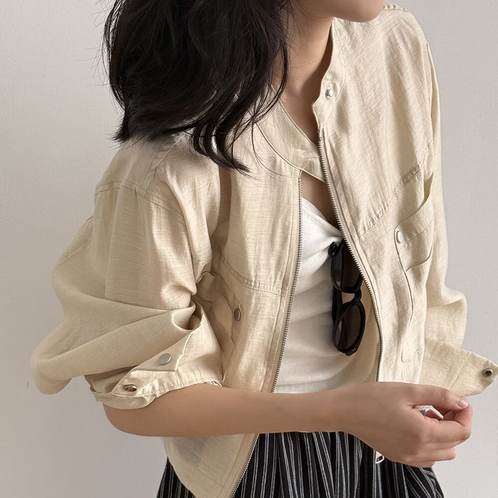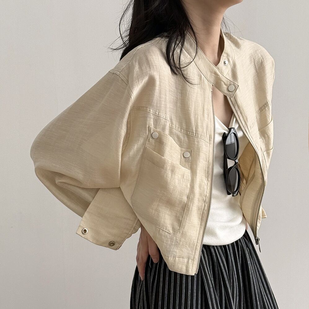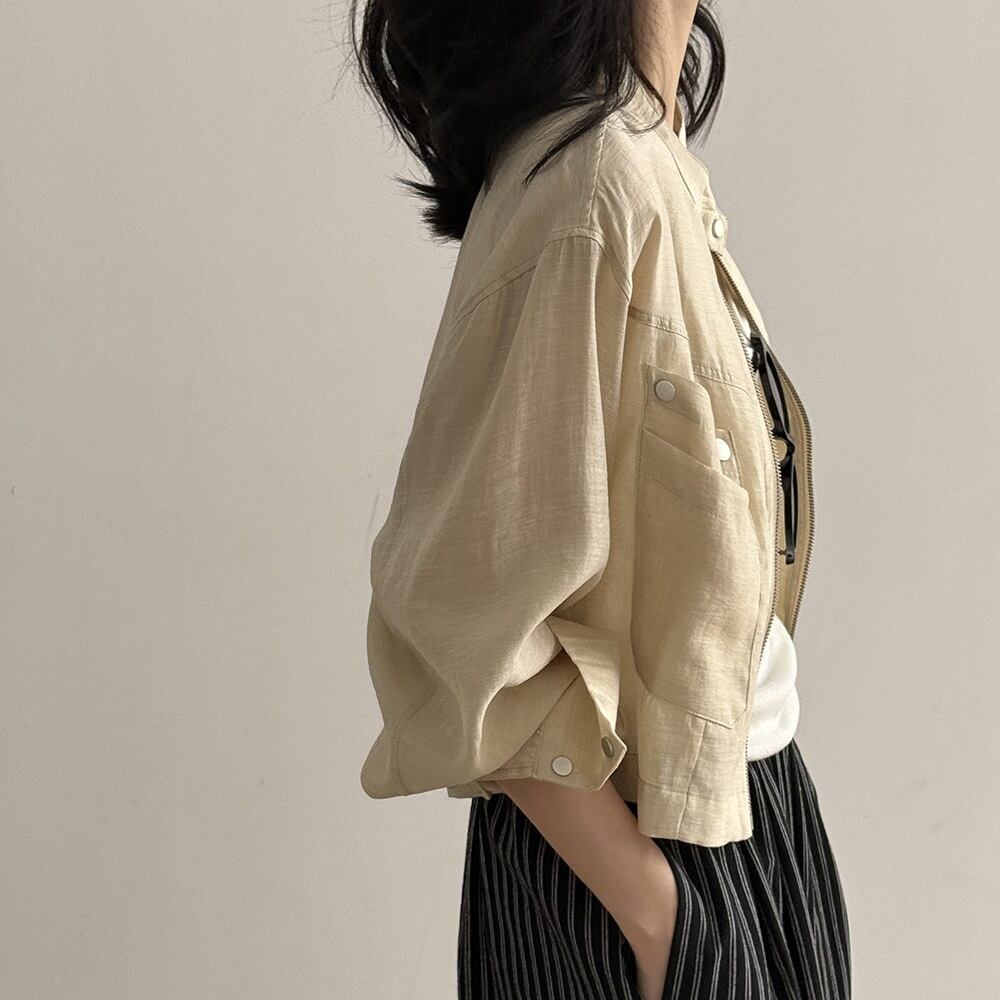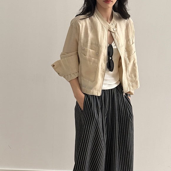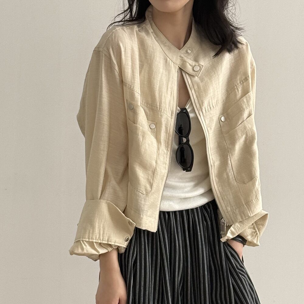 ナチュラルな風合いが魅力のライトジャケット。 コンパクトな丈感とスタンドカラーが洗練された印象を演出し、胸元のポケットディテールで程よいカジュアルさをプラス。 羽織るだけでこなれ感のあるスタイリングが完成します。 【商品詳細】 サイズ: ▼Mサイズ 肩幅45cm, 胸囲90cm, 裾丈94cm, 袖丈56cm, 着丈48cm ▼Lサイズ 肩幅46cm, 胸囲94cm, 裾丈98cm, 袖丈57cm, 着丈49cm (海外製品のため1~3㎝程度誤差がある場合がございます。) 素材:ポリエステル、リネン、その他 カラー:ホワイト、ベージュ ※着用モデル情報 身長・体重 155cm 47㎏ スリーサイズ 84㎝ 63cm 85cm 着用サイズ M 【洗濯】 手洗いや専門のドライクリーニングをお勧めします。 30度以上のお湯に長時間浸さないでください。 他の色のお洋服と分けて洗濯してください。 アイロンは、低温にしてください。 ■Evermodの人気商品一覧はこちらからご確認いただけます。 https://onlinestore.evermod.shop/categories/4311097 ■<送料無料まであと少し>の方は、プライス別にもアイテム検索できます。 https://onlinestore.evermod.shop/categories/5070150 【商品発送について】 こちらの商品は海外店舗より直接発送となる為、 ご入金から発送まで10日~3週間前後いただきます。 【注意事項】 ・タイミングによっては 商品在庫切れにより 注文キャンセルとさせていただく恐れもございますので、 予めご了承くださいませ。 ・こちらは輸入品となります。 日本製とは検品基準が異なる為、新品未使用品でも ごくわずかな汚れや傷がある場合もございます。 ・商品の色味は、お手持ちのスマートフォンの画面に よって実物と若干異なる場合がございます。 ・イメージ違いやサイズ交換等、お客さまご都合による 交換、返品は対応出来かねます。 ■(重要)ご購入前にこちら(Shop Guide)をお読みください https://onlinestore.evermod.shop/about