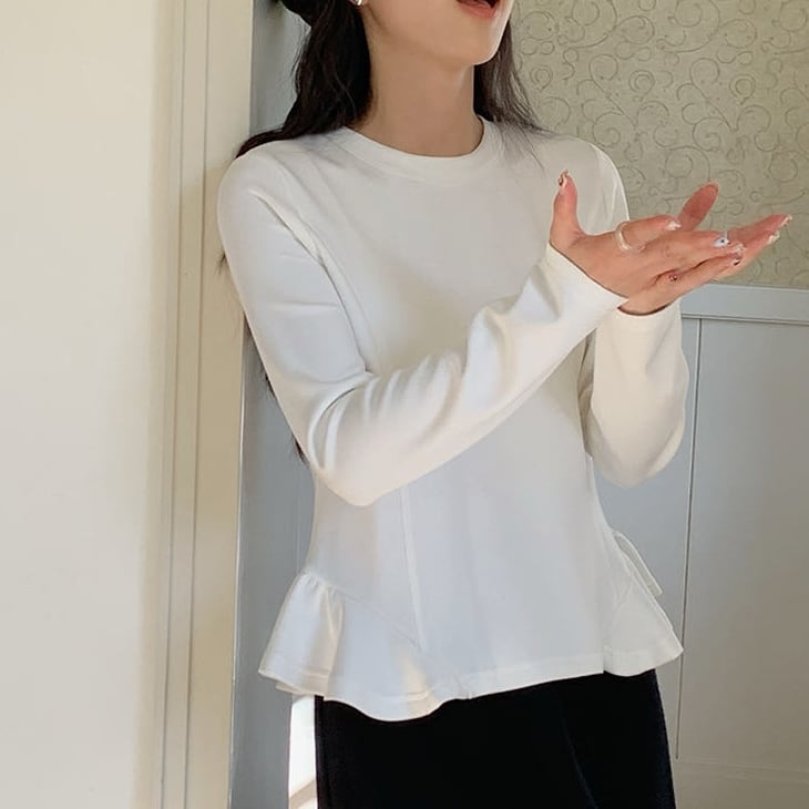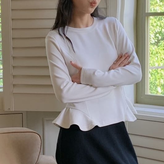 シンプルな中にフェミニンなエッセンスをプラスしたペプラムデザインのトップス。