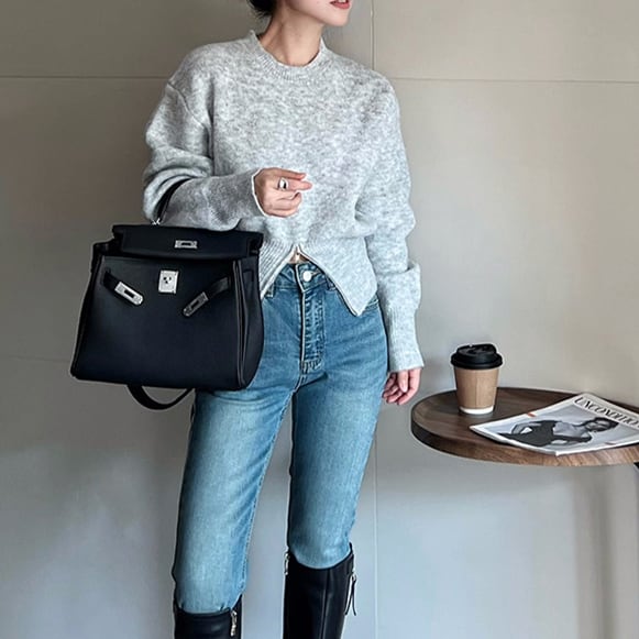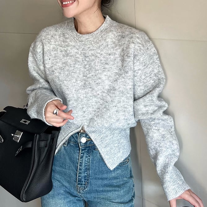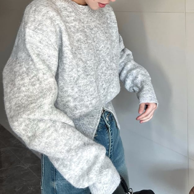 柔らかなグレーの生地が上品な印象を与えるニットプルオーバー。