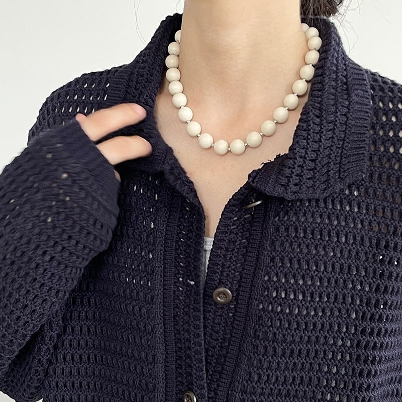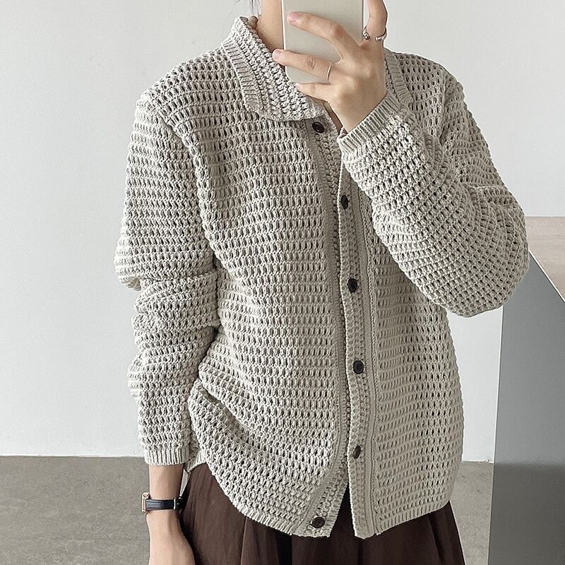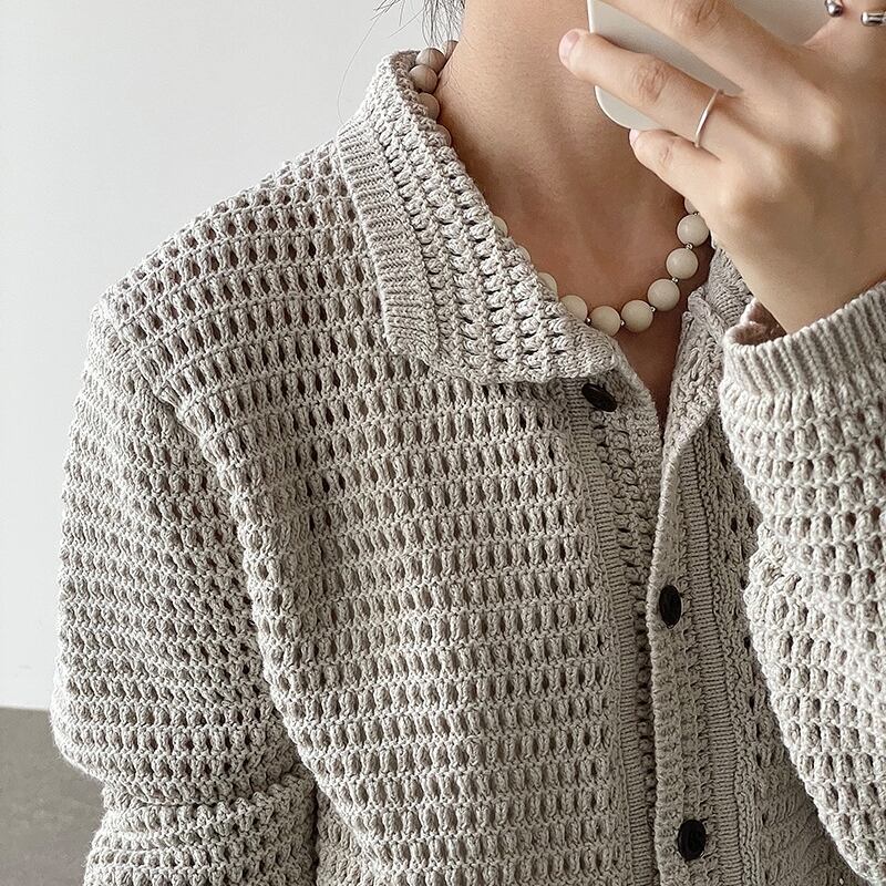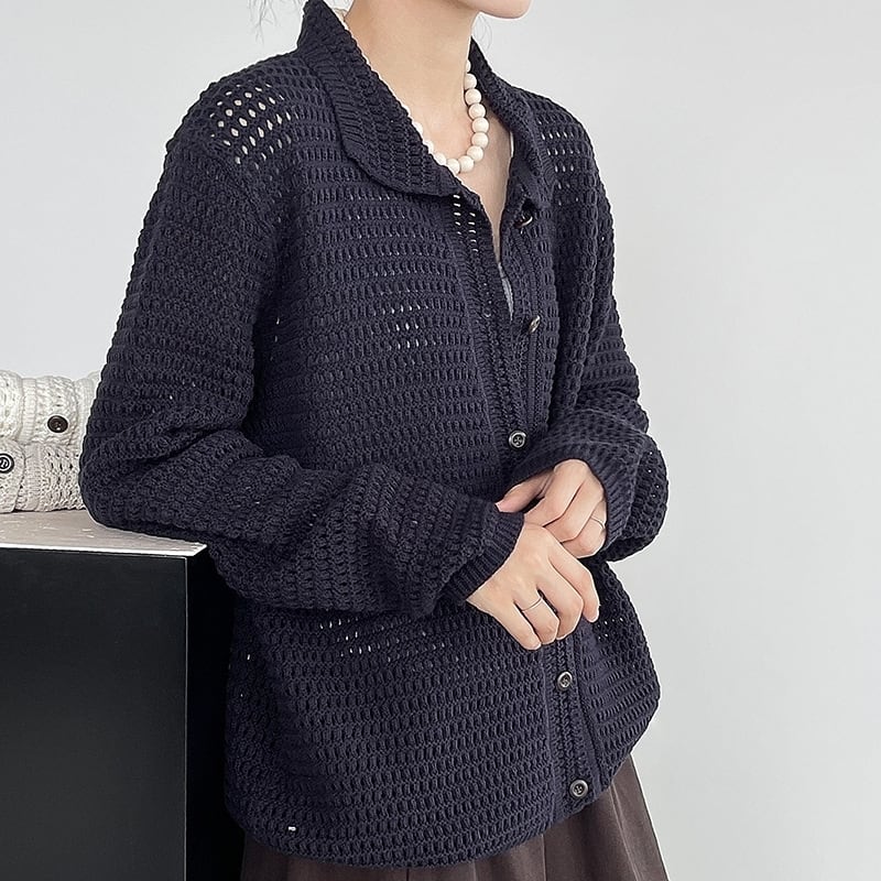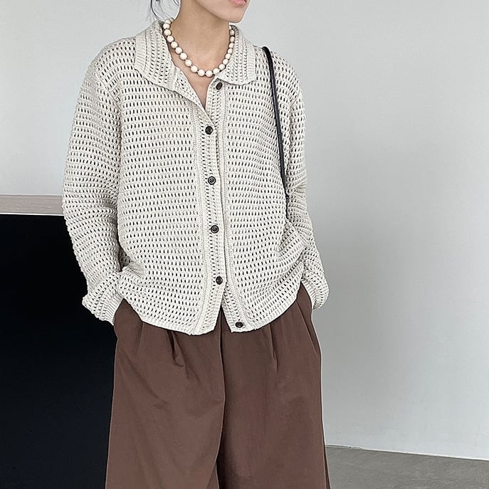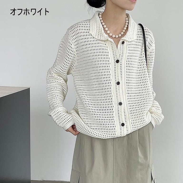 軽やかな透かし編みが魅力のクロシェライクなニットカーディガン。