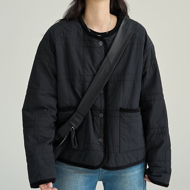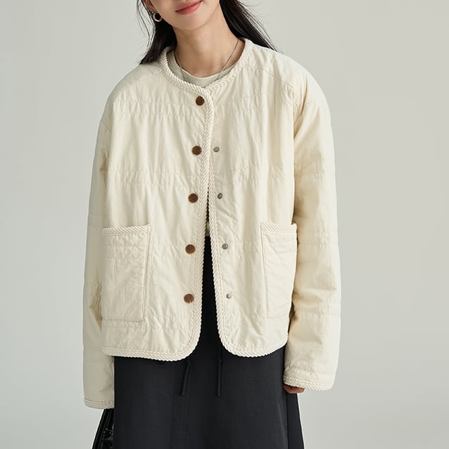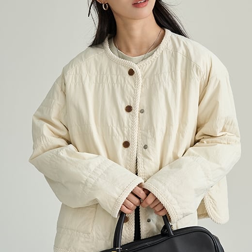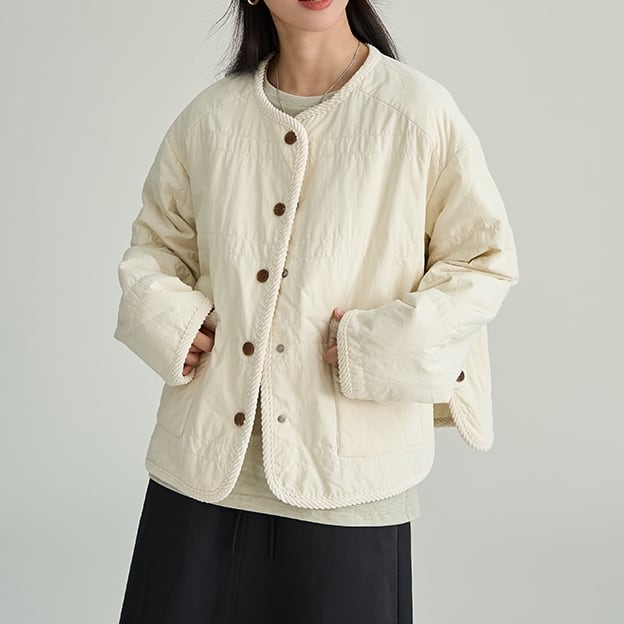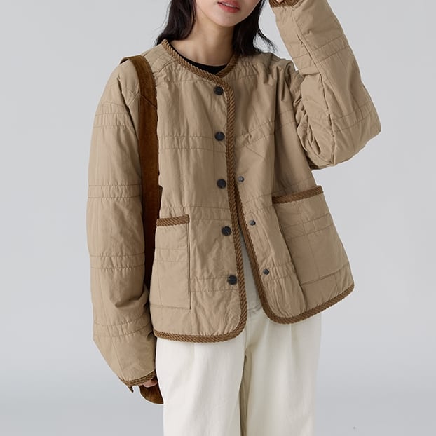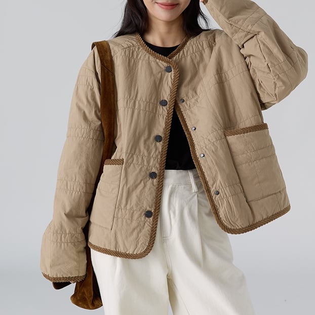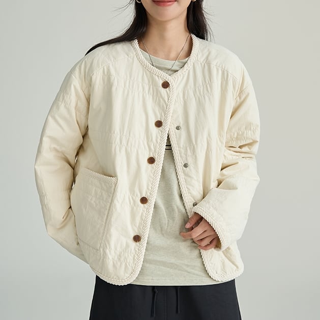 やわらかなキルティング生地に、コードパイピングがアクセントになったライトジャケット。 サイドのポケットや袖口のタブなど、さりげないディテールが大人のカジュアルスタイルにマッチ。季節の変わり目に使いやすい、軽やかなアウターです。 【商品詳細】 サイズ: ▼Mサイズ 着丈 61cm, 胸囲 126cm, 肩幅 53.5cm, 袖丈 57.8cm ▼Lサイズ 着丈 62cm, 胸囲 130cm, 肩幅 54.5cm, 袖丈 58.8cm (海外製品のため1~3㎝程度誤差がある場合がございます。) 素材:綿、ポリエステル /(中)綿・ウール カラー:オフホワイト、ブラック、ベージュ ※着用モデル情報 身長・体重 166cm 45㎏ スリーサイズ 80㎝ 58cm 88cm 着用サイズ M 【洗濯】 冷水で洗ってください。 長時間浸さないでください。 風通しの良い場所で吊るして乾かし、長時間直射日光に当てないでください。 ■Evermodの人気商品一覧はこちらからご確認いただけます。 https://onlinestore.evermod.shop/categories/4311097 ■<送料無料まであと少し>の方は、プライス別にもアイテム検索できます。 https://onlinestore.evermod.shop/categories/5070150 【商品発送について】 こちらの商品は海外店舗より直接発送となる為、 ご入金から発送まで10日~3週間前後いただきます。 【注意事項】 ・タイミングによっては 商品在庫切れにより 注文キャンセルとさせていただく恐れもございますので、 予めご了承くださいませ。 ・こちらは輸入品となります。 日本製とは検品基準が異なる為、新品未使用品でも ごくわずかな汚れや傷がある場合もございます。 ・商品の色味は、お手持ちのスマートフォンの画面に よって実物と若干異なる場合がございます。 ・イメージ違いやサイズ交換等、お客さまご都合による 交換、返品は対応出来かねます。 ■(重要)ご購入前にこちら(Shop Guide)をお読みください https://onlinestore.evermod.shop/about