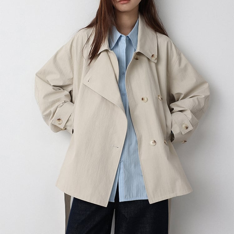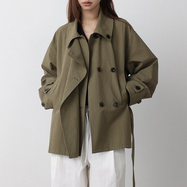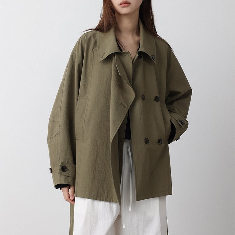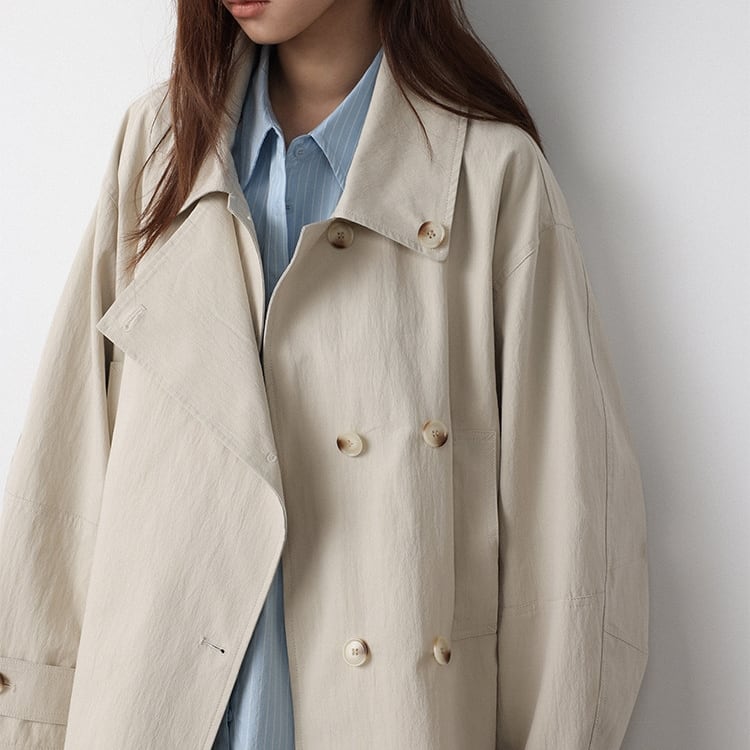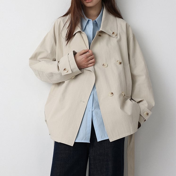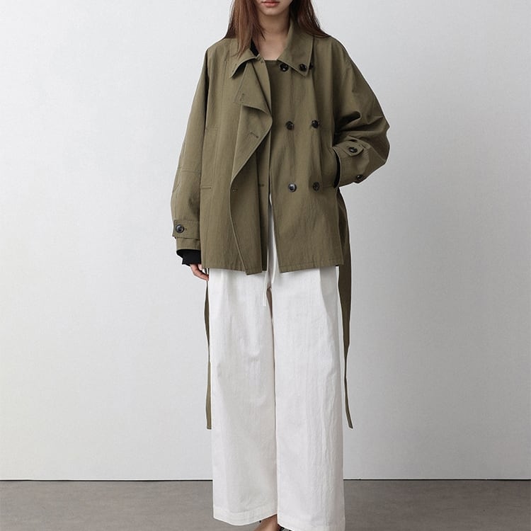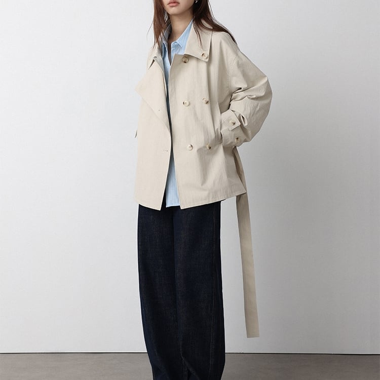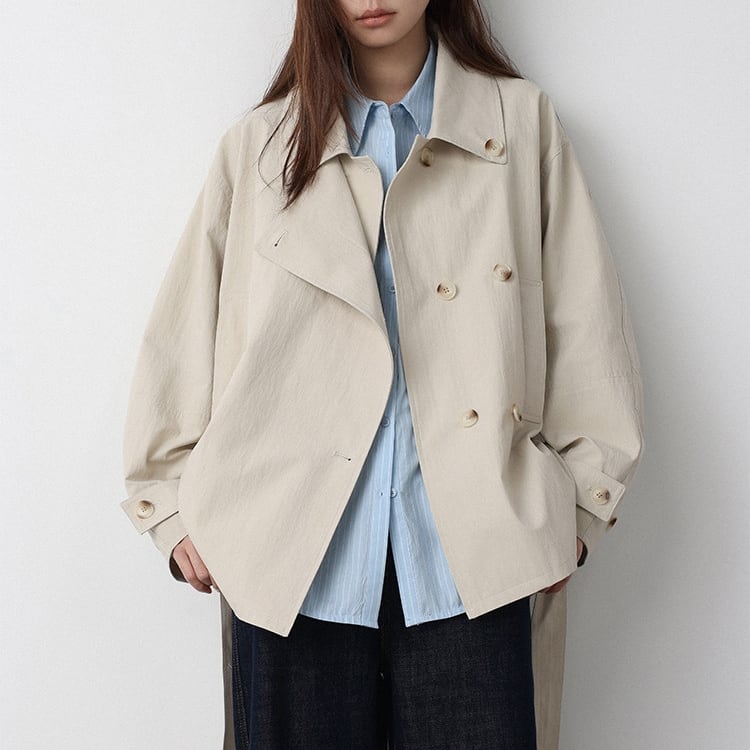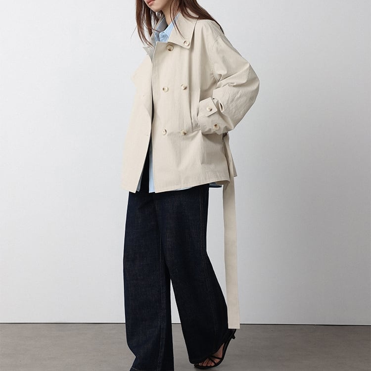 ゆとりのあるシルエットが魅力のショート丈トレンチコート。
