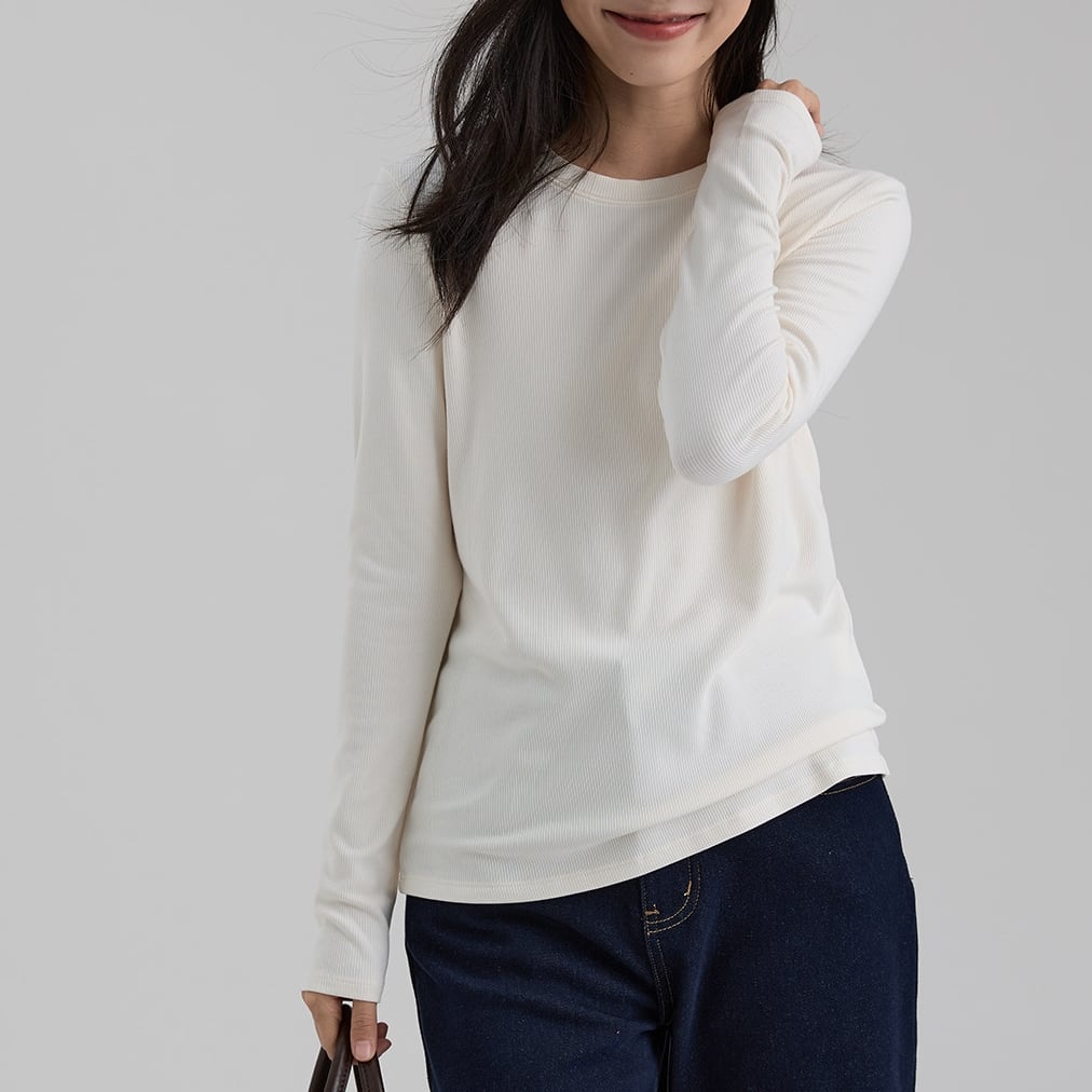 シンプルで着回しやすいクルーネックデザインの長袖カットソー。