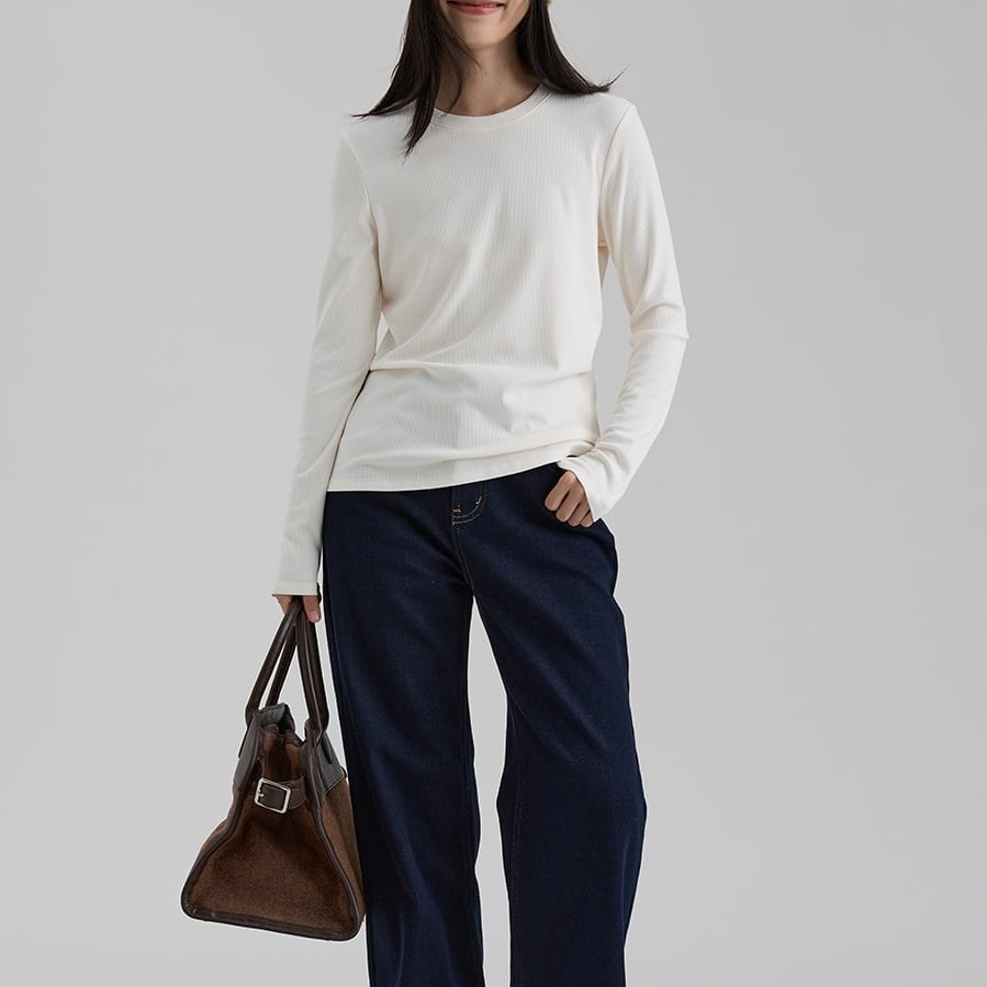 細めのリブ素材がさりげないアクセントになり、すっきりとした印象に仕上げています。