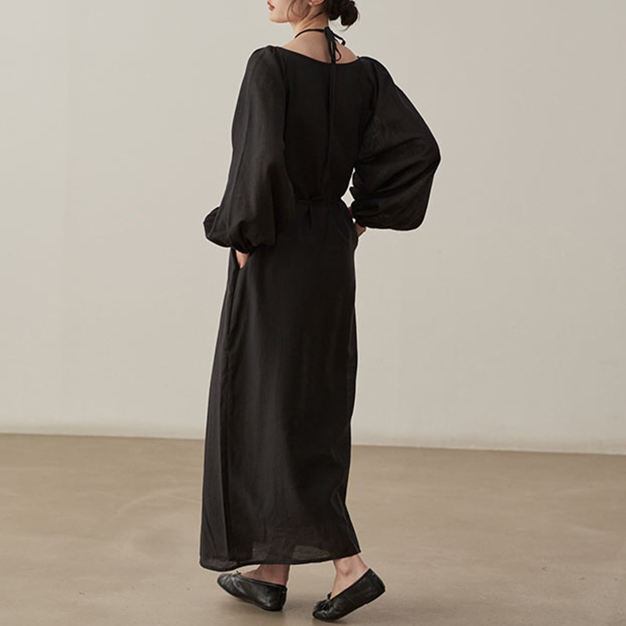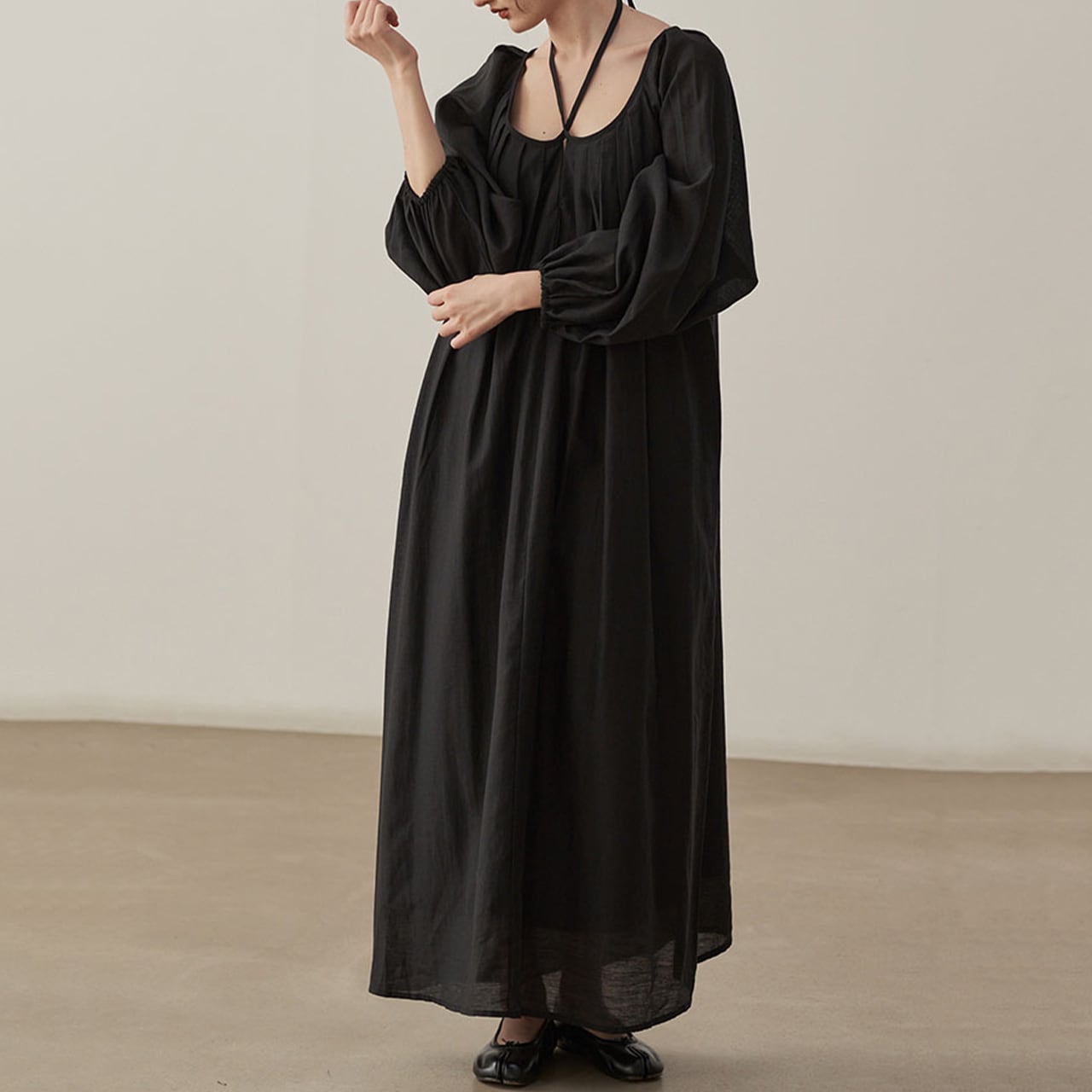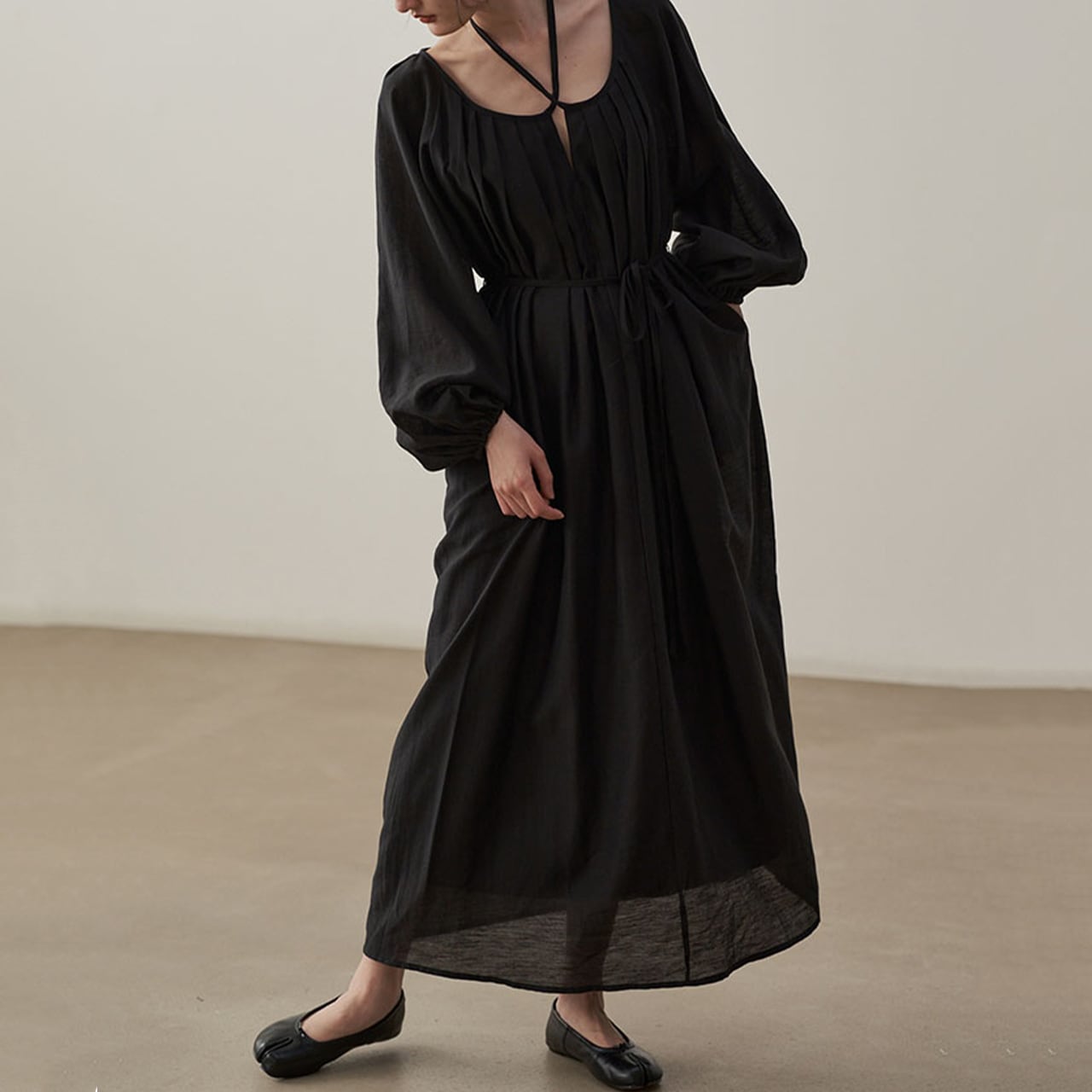 胸元にあしらわれたギャザーとホルターネックが特徴的なワンピース