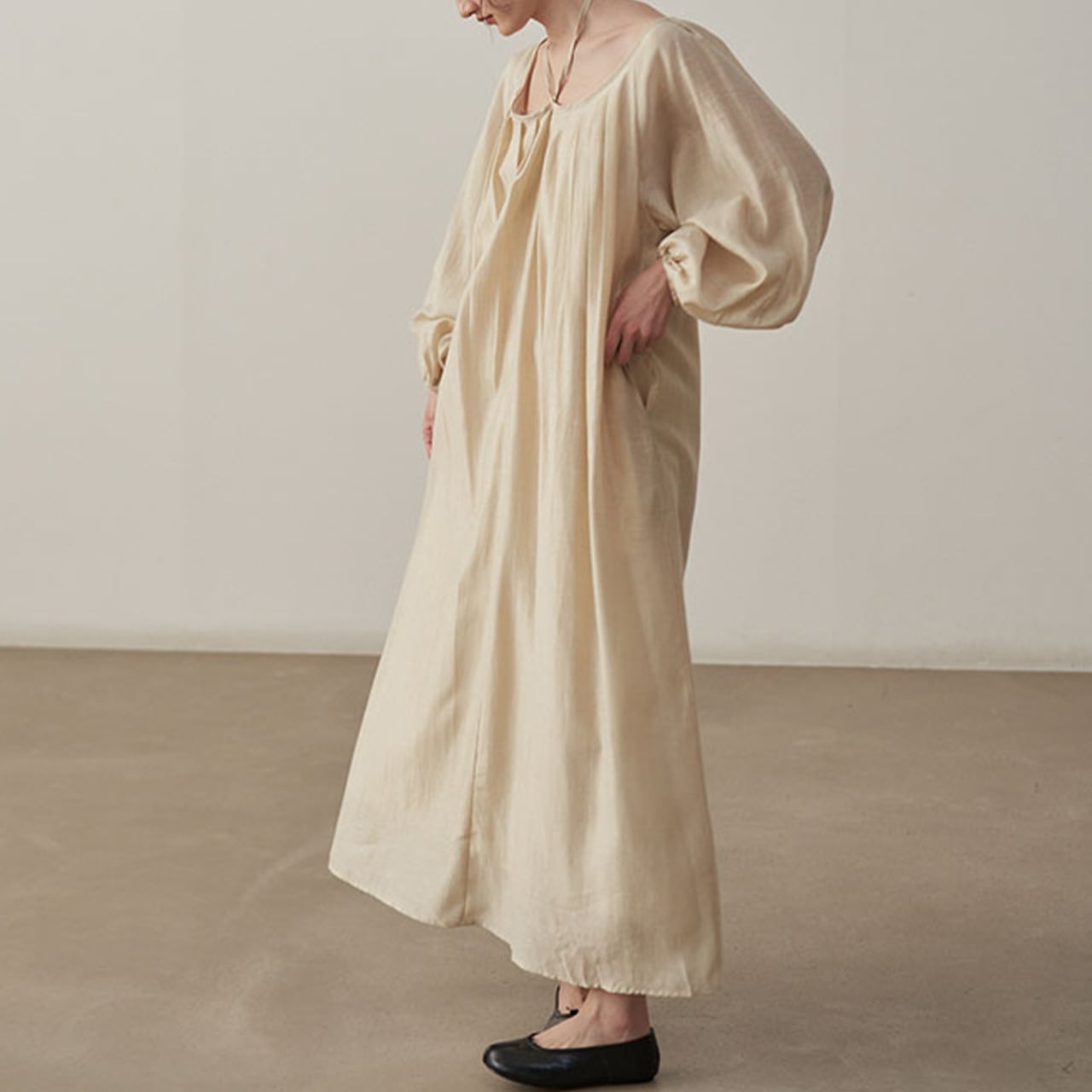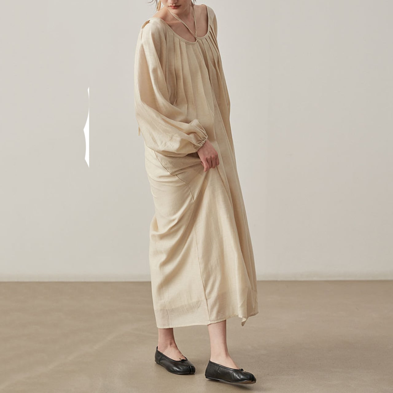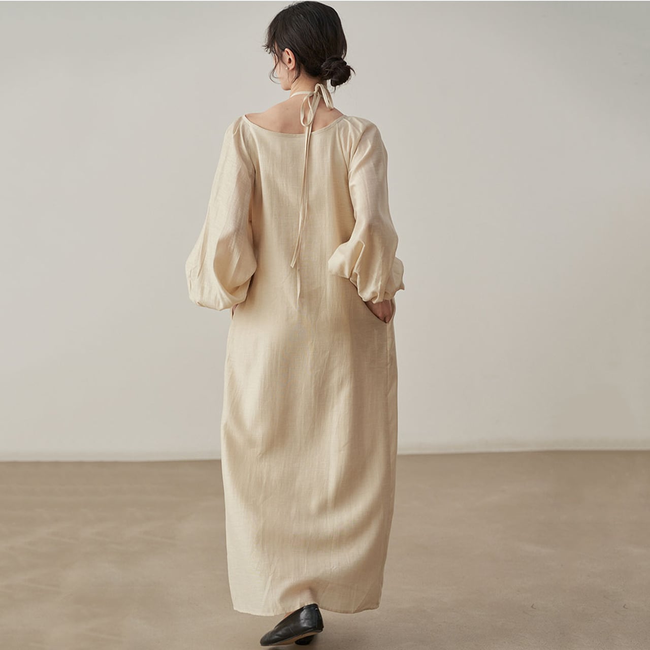 胸元にあしらわれたギャザーとホルターネックが特徴的なワンピース