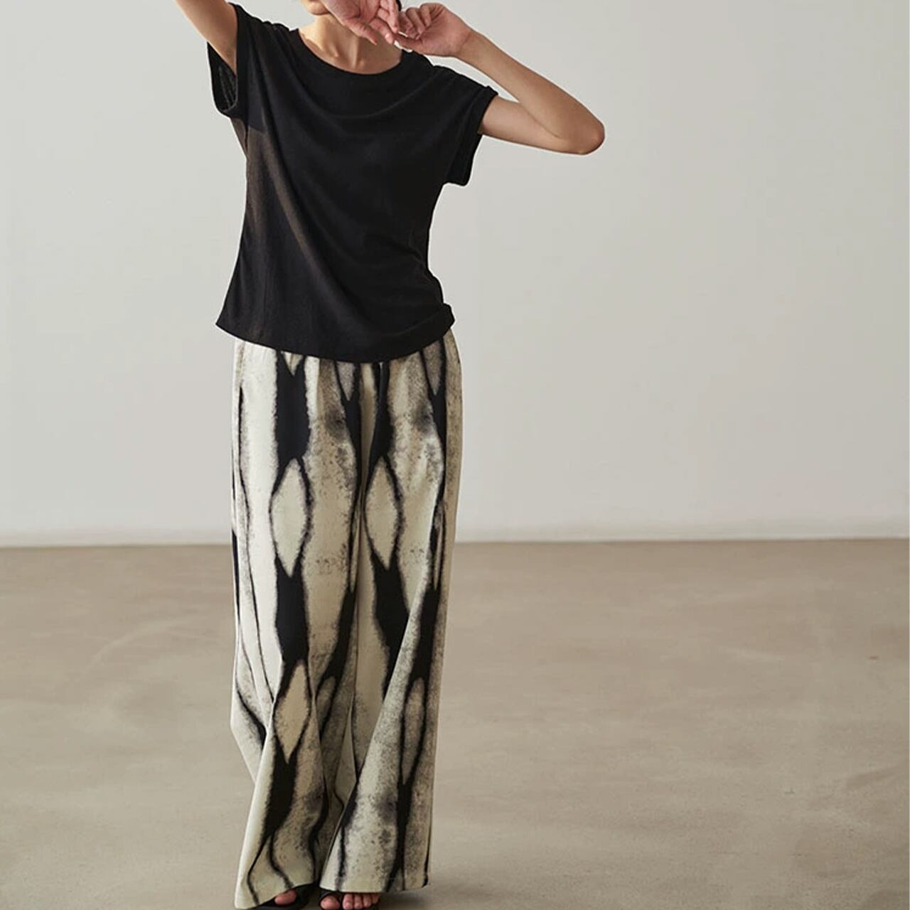大胆なモノトーンプリントが目を引くワイドパンツ