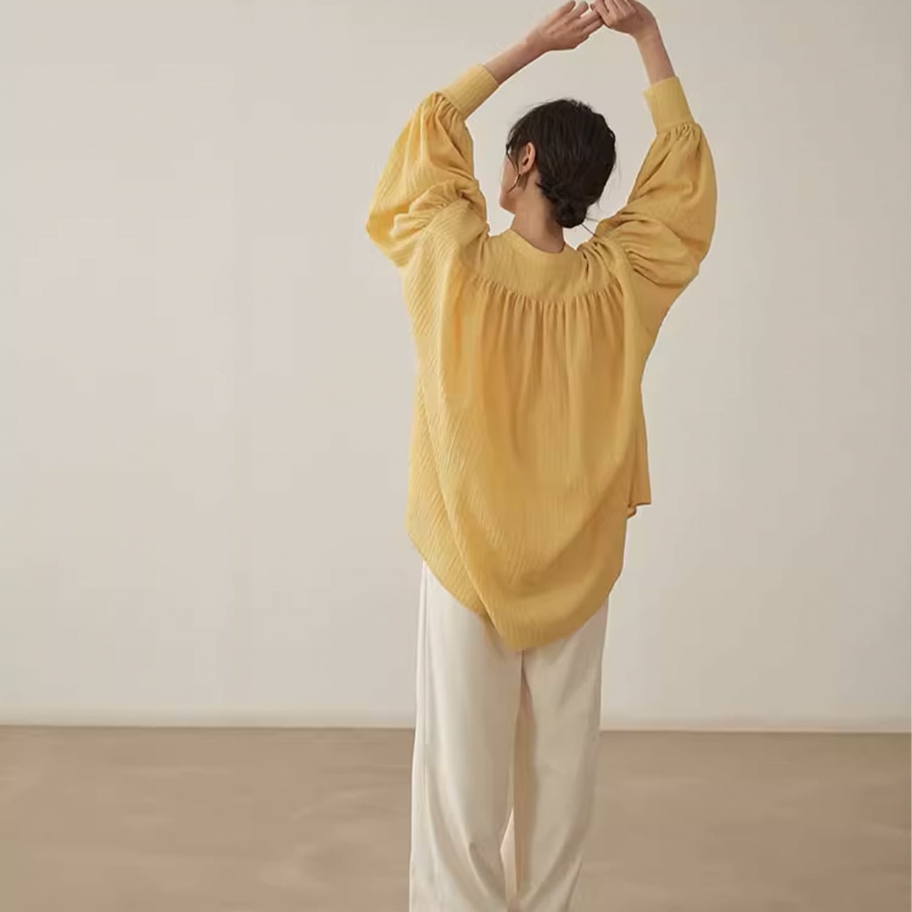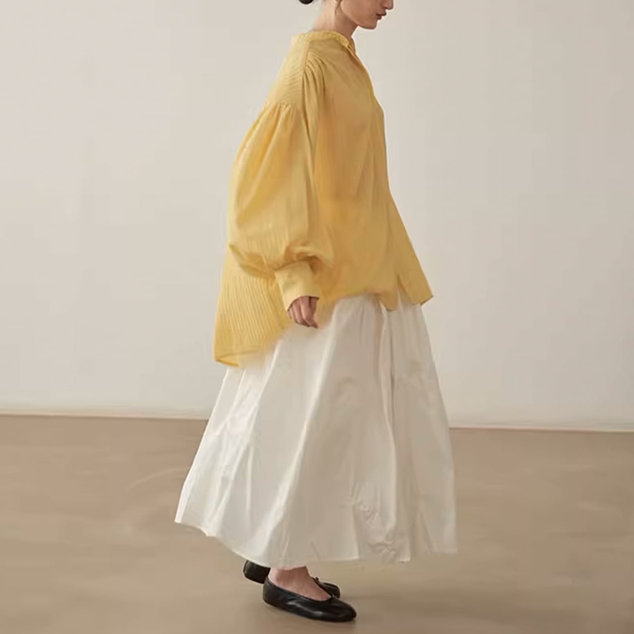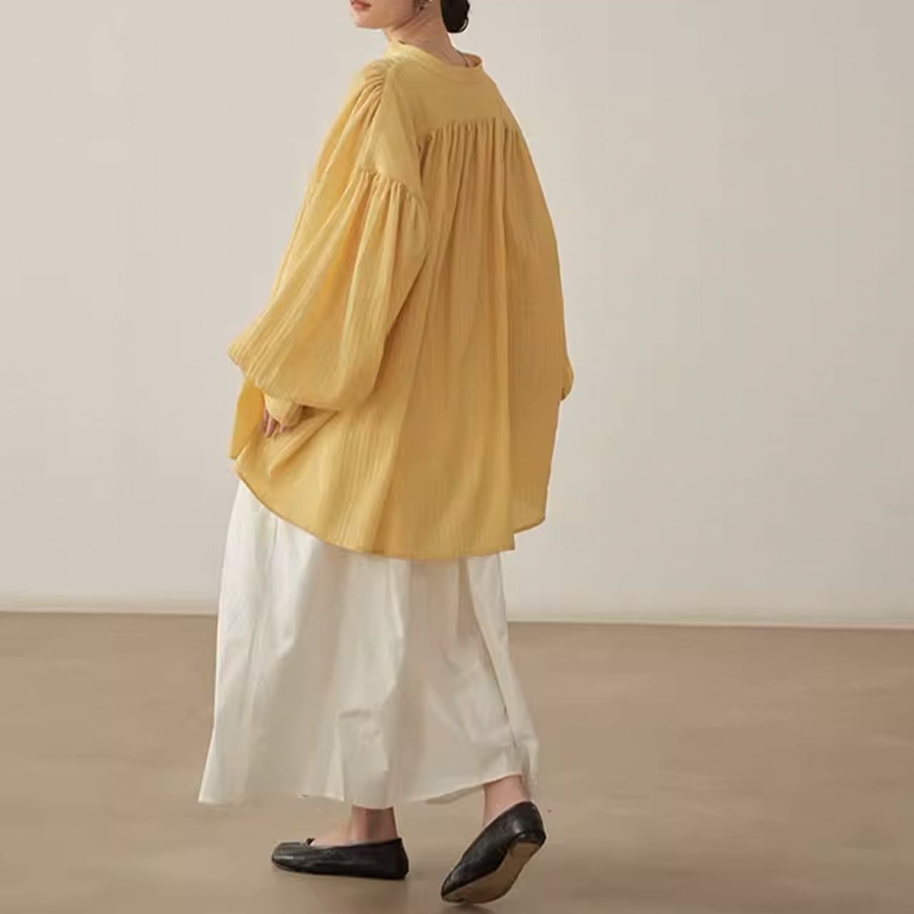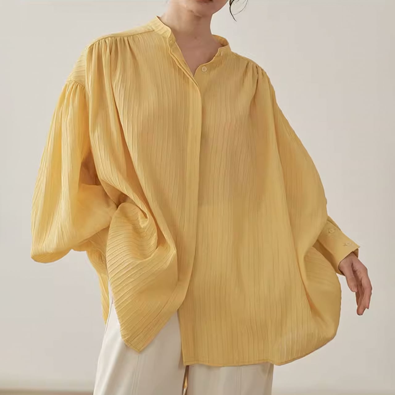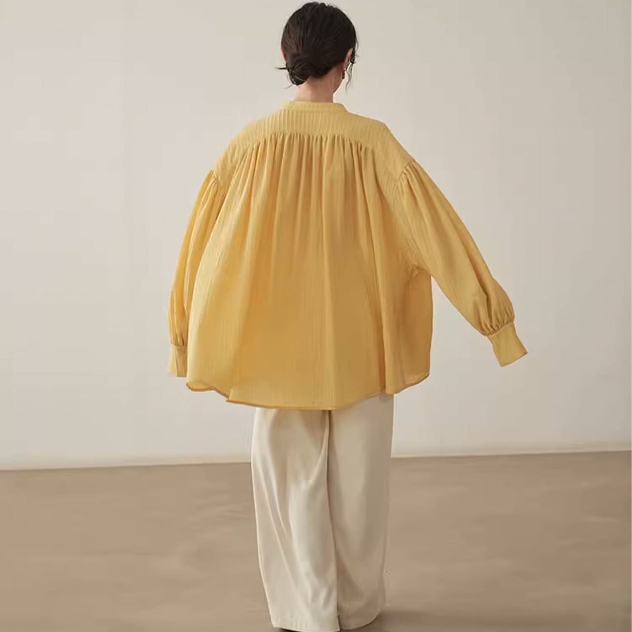 ゆったりとしたルーズシルエットのタンドカラーシャツ