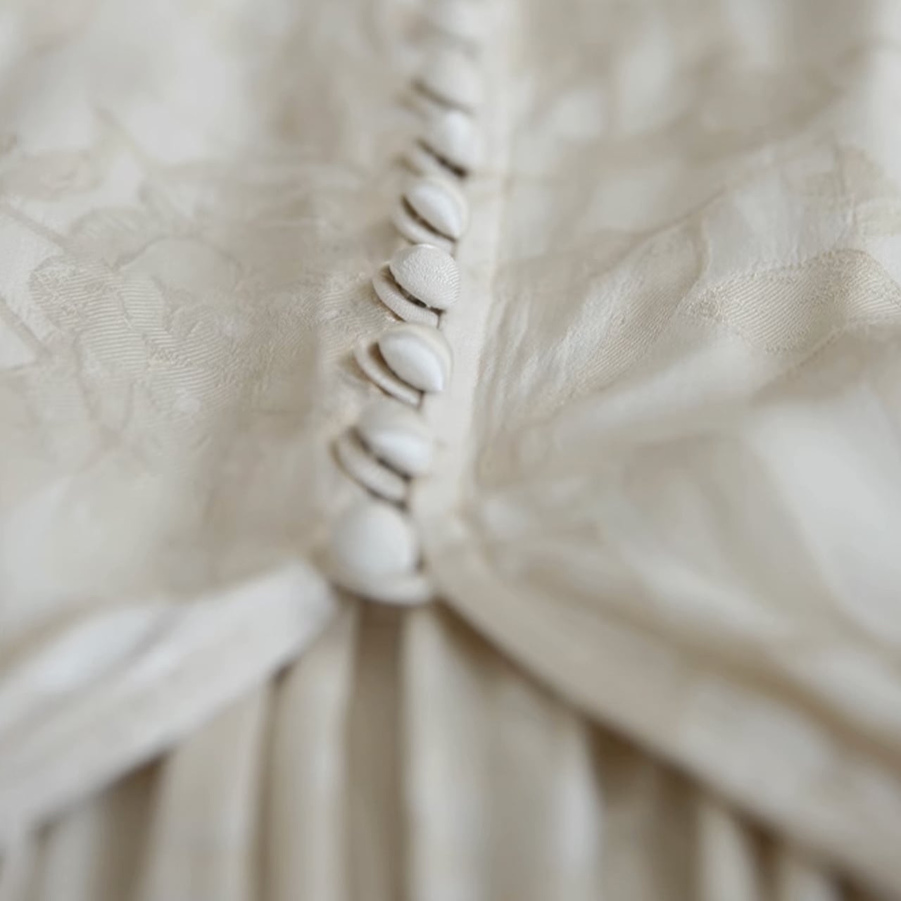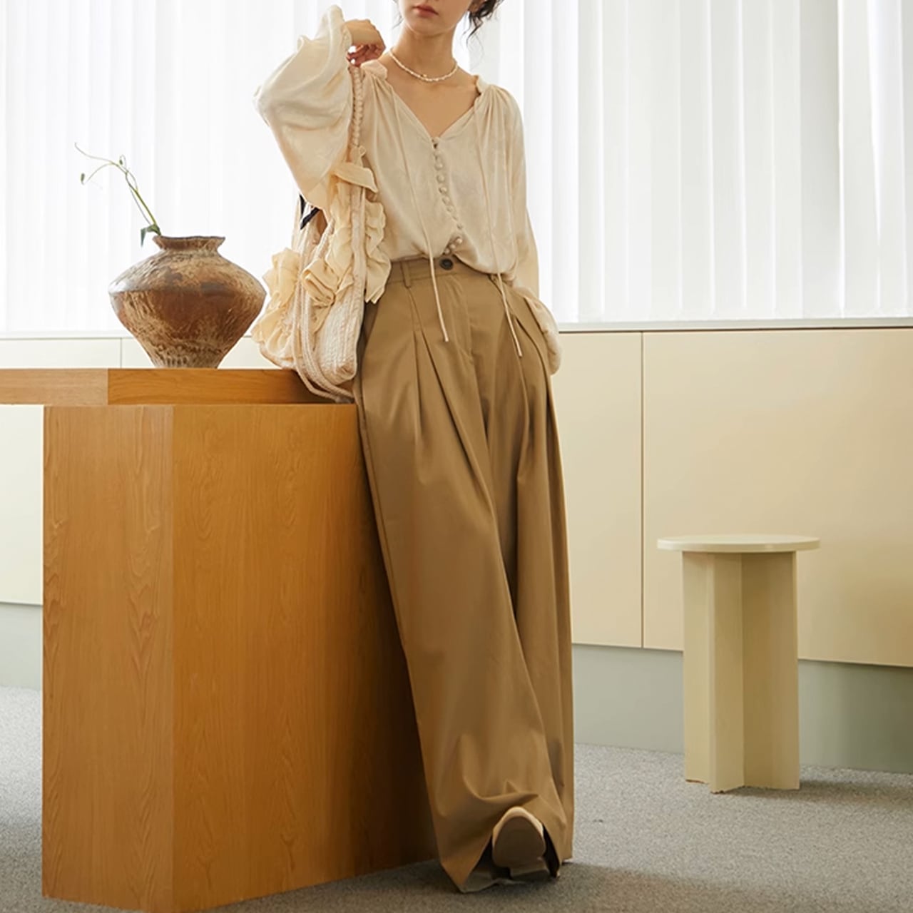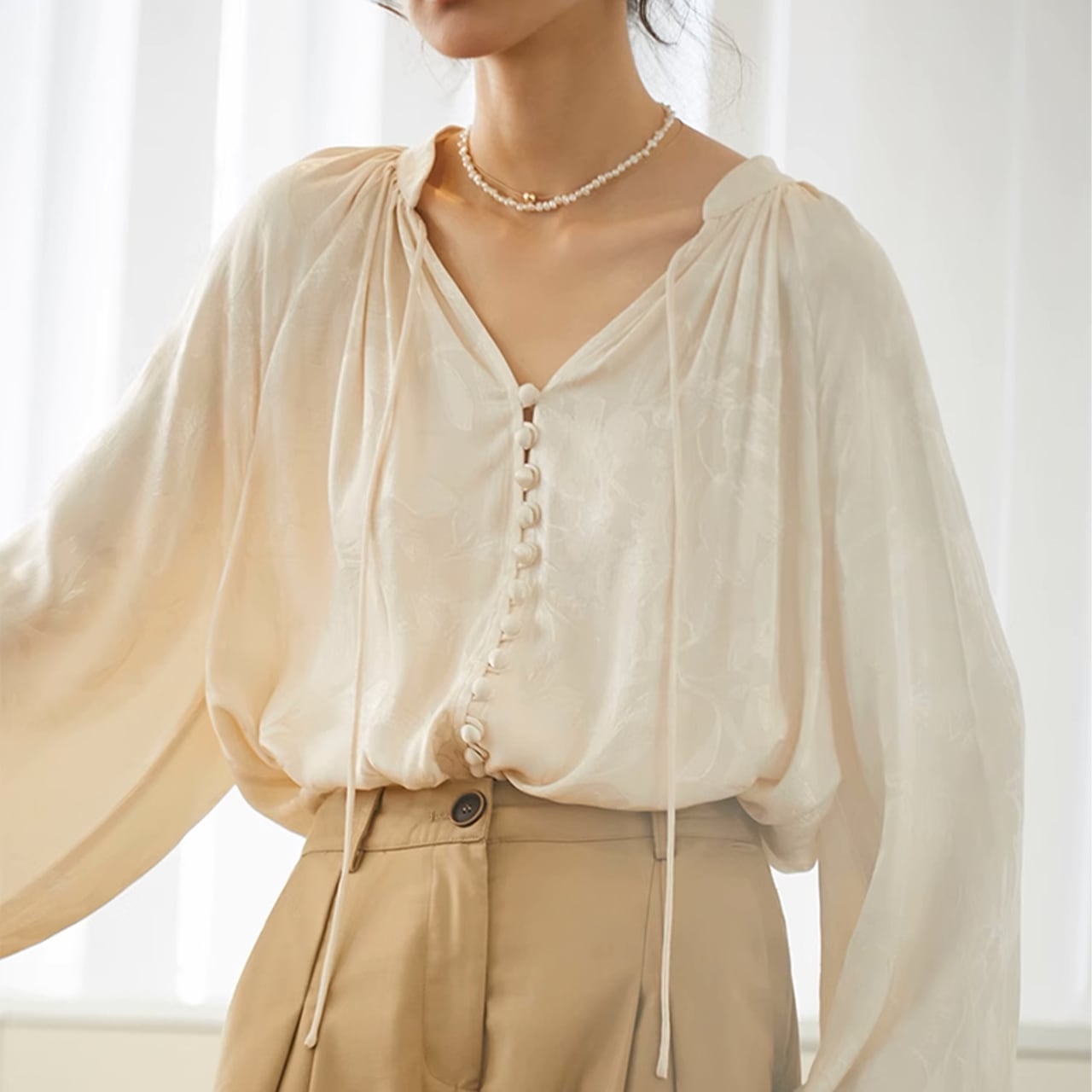 くるみボタンをアクセントで添えた上品な雰囲気のブラウス