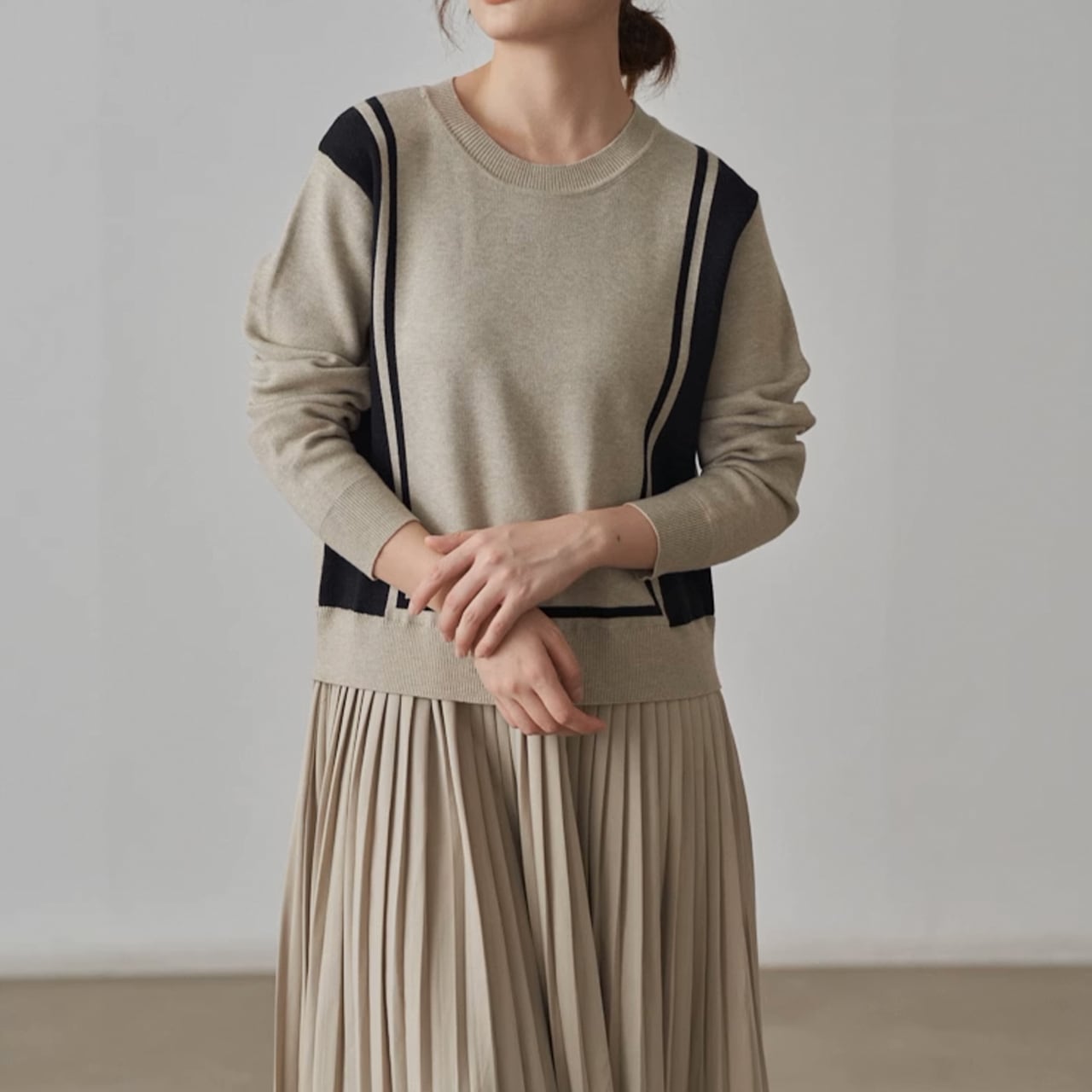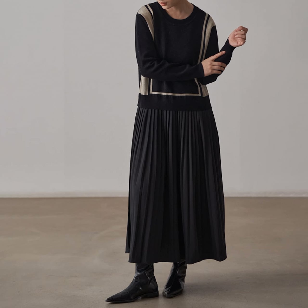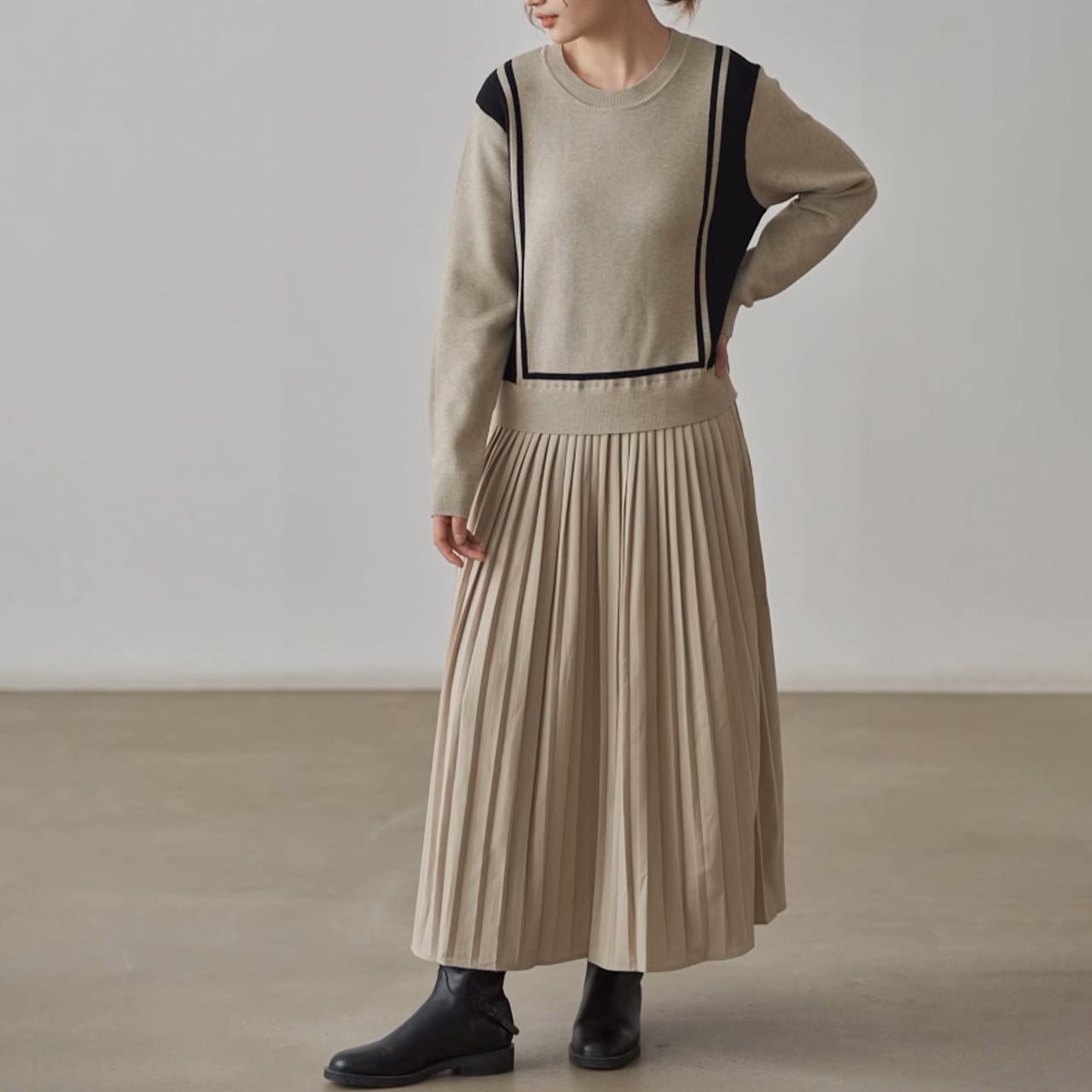 長袖ニットとプリーツスカートがドッキングしたフェイク2ピースのワンピース