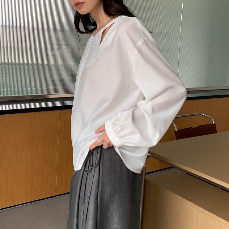 胸元に施されたカットアウトディテールが、フェミニンさとモダンな印象をプラスします。